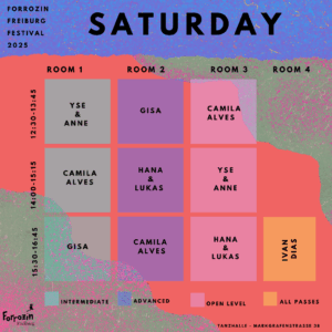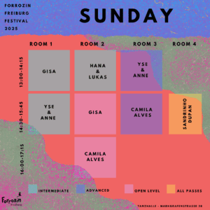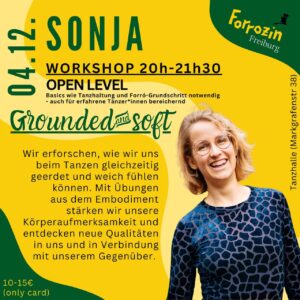Wir erforschen, wie wir uns beim Tanzen gleichzeitig geerdet und weich fühlen können. Mit Übungen aus dem Embodiment stärken wir unsere Körperaufmerksamkeit und entdecken neue Qualitäten in uns und in Verbindung mit unserem Gegenüber. - Voraussetzungen: Open level – nur Basics wie Tanzhaltung und Forró-Grundschritt notwendig – auch für erfahrene Tänzer:innen bereichernd